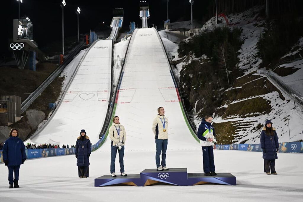 Ouro: Anna Odine Strøm (Noruega) | Prata: Nika Prevc (Eslovênia) | Bronze: Nozomi Maruyama (Japão)