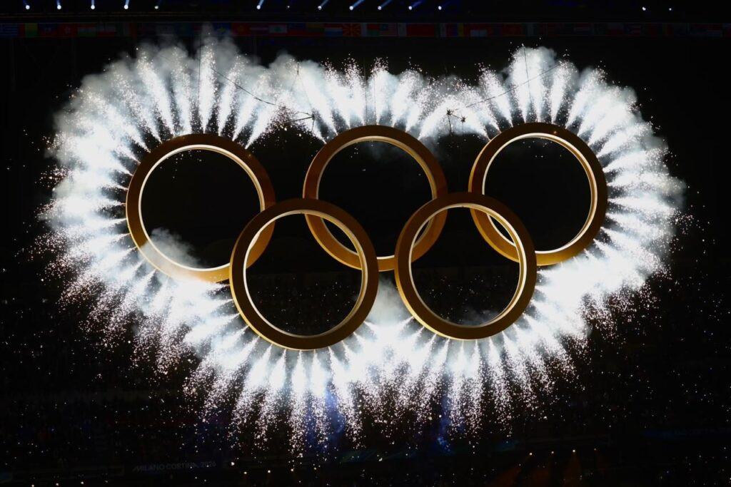 Para encerrar a primeira parte artística antes dos desfiles, os anéis olímpicos foram formados no Estádio San Siro com destaque para o dourado e muita luz.