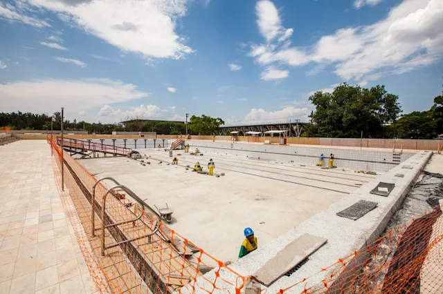 nas bordas da piscina. A arquibancada está na fase de concretagem e